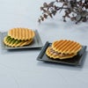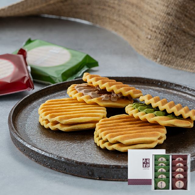 口ほどけの良いザックリした歯ごたえの波型クッキー生地にオリジナルの小倉クリームと抹茶クリームをサンドして仕上げた洋風煎餅です。