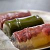 【水羊羹(抹茶)】 白こしあん(いんげん豆、砂糖)(国内製造)、砂糖、葛粉、抹茶/クチナシ色素