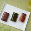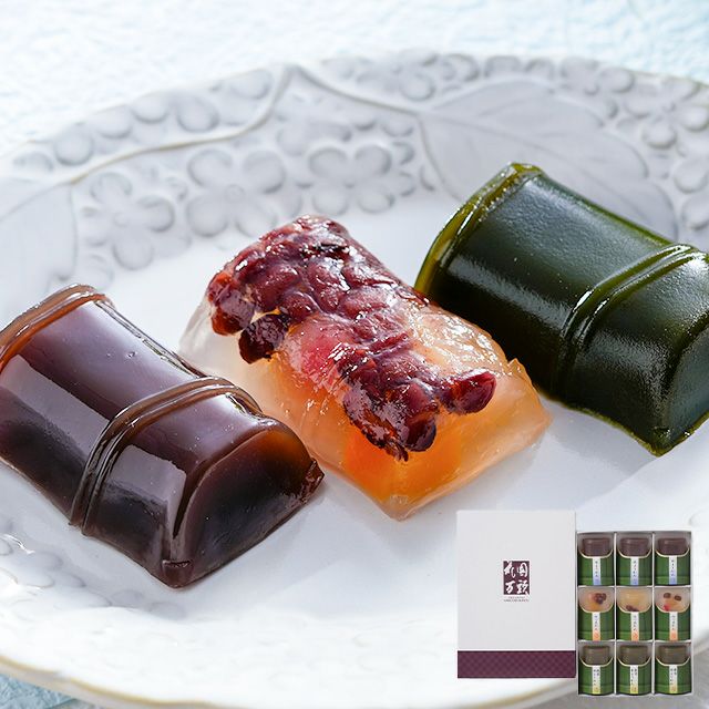 花園万頭伝統の生餡を贅沢に使用した水羊羹、白あんをベースに抹茶香りの際立つ抹茶水羊羹、清涼感たっぷりのみつ豆羹の詰合せです。