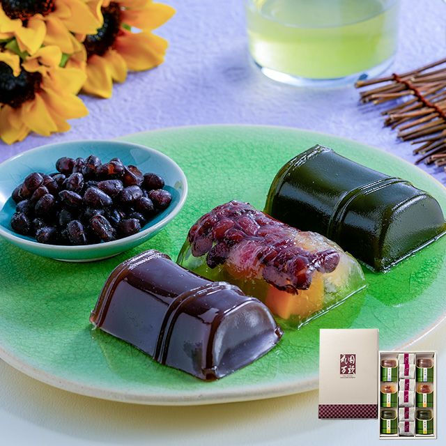 豆芯までしっとりと甘みを含ませた舌にとろけるような甘納豆「ぬれ甘なつと」と、花園万頭伝統の生餡を贅沢に使用した水羊羹、白あんをベースに抹茶香りの際立つ抹茶水羊羹、清涼感たっぷりのみつ豆羹の詰合せです。
