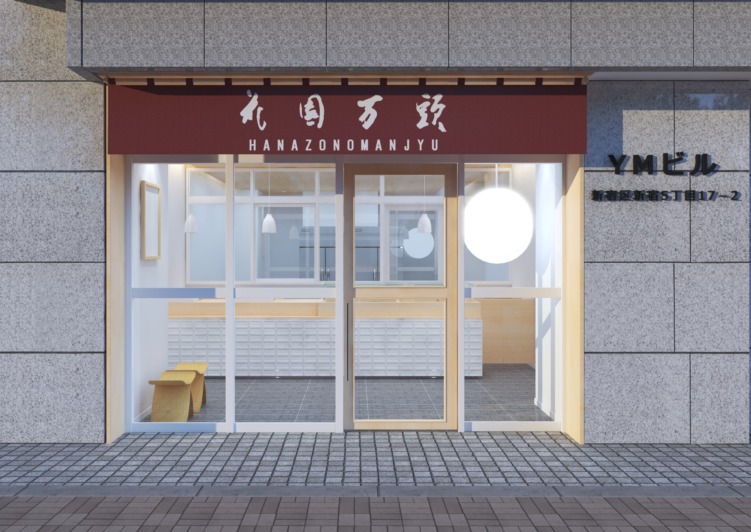 店内は、販売商品のカラーである“白と茶”を基調に、シンプルな和モダンデザインでまとめました。店内中央は大きなガラス窓で仕切られ、奥にはキッチンが覗け、焼きたて・蒸し立ての様子がご覧いただけます。